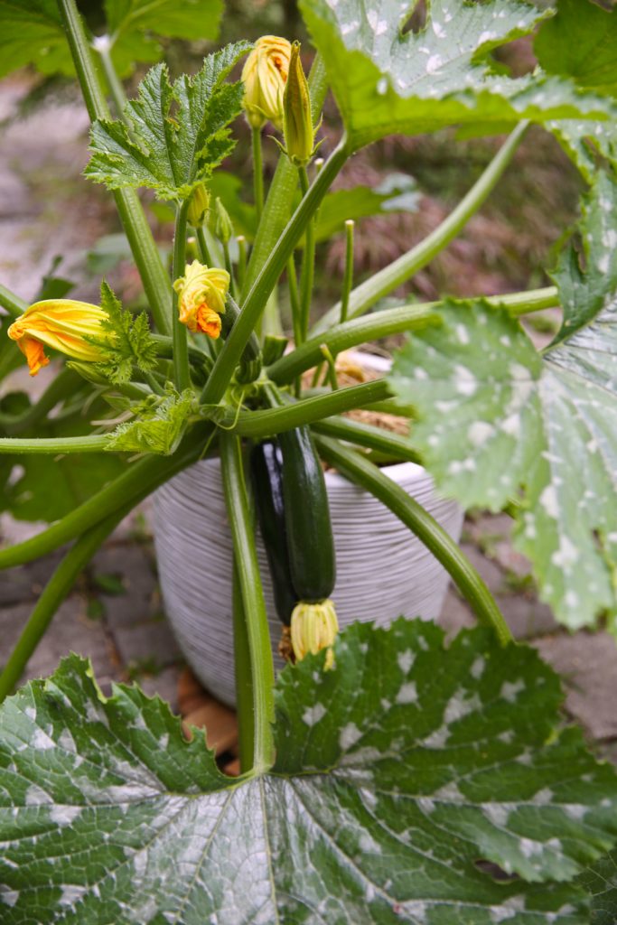 Všimněte si cukety v květináči.